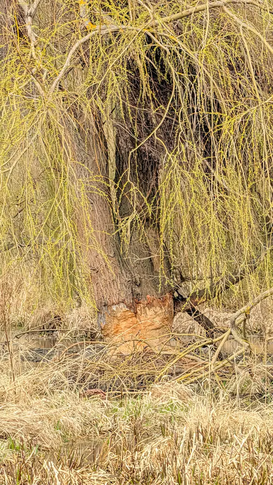 Wir haben Bäume gesehen, die regelrecht fachmännisch gefällt wurden. Andere sind bereits rundum abgenagt, wie diese riesige „arme“ alte Weide.
